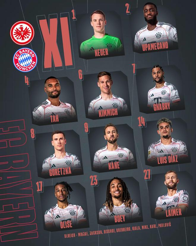 拜仁客战法兰克福:凯恩、迪亚斯、奥利塞首发,基米希出战