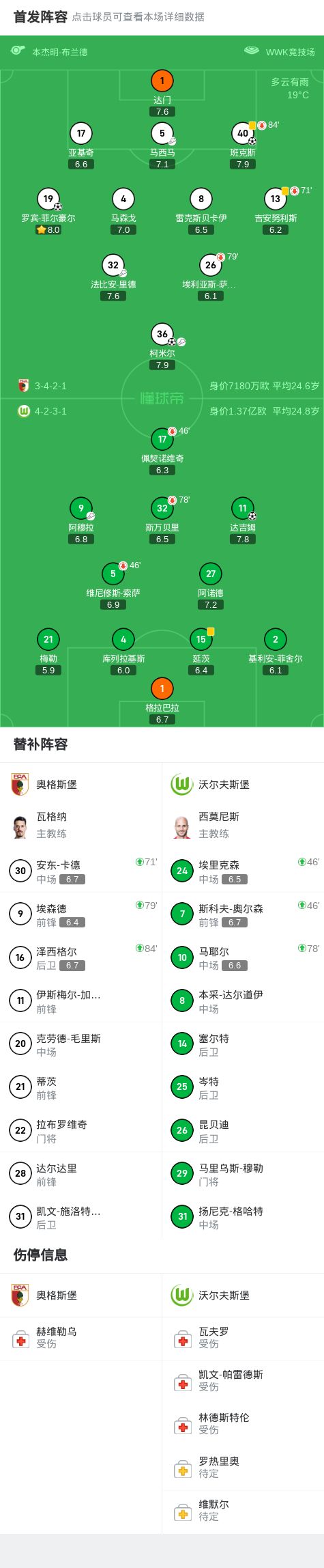 北京时间10月4日德国足球顶级联赛 联赛 第6轮,奥格斯堡主场对阵沃尔夫斯堡。奥格斯堡班克斯破门,柯米尔破门,罗宾-菲尔豪尔破门。沃尔夫斯堡达吉姆破门。最终比分奥格斯堡 3-1 沃尔夫斯堡。